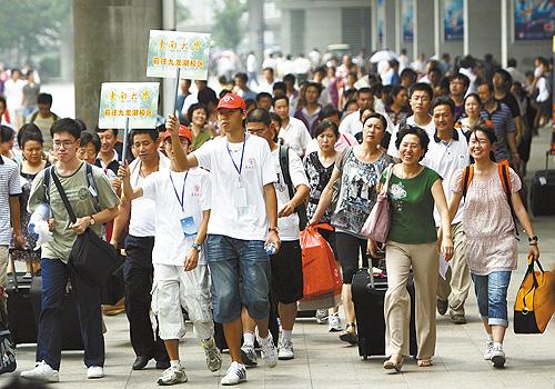 【龙虎网报道】昨日是东南大学2009级新生入学报到的第一天,近4000名本科新生开始报到入学。图为老生志愿者引导大一新生走出南京火车站。本报记者徐琦摄