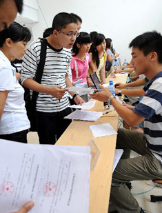 8月29日,东南大学的工作人员(右)在为新生办理相关手续。当日,南京东南大学2009级新生开始报到入学。学校采取了各项人性化和数字化服务措施迎接新生,包括组织各院系学生志愿者为新同学提供入学咨询、搬运行李、校园向导、办理手续等服务。[详细] (来源:要闻)