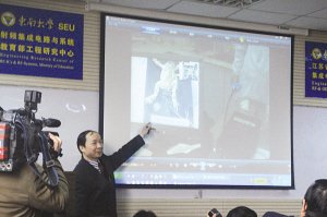 他向记者再现“截瘫”大鼠恢复动作这一实验:一只大鼠脊椎受损躺在“手术台”上奄奄一息。科学家在受损点上部安装微电子神经桥的发射端,在受损点下部安装接收端,在受损点之上架起了一座“桥”。当发射端接收到神经元信号后,直接跳开了破损口,把信号输送到接收端,实现再生。当接收端收到信号的那一刻,科学家发现,大鼠明显动了一下。