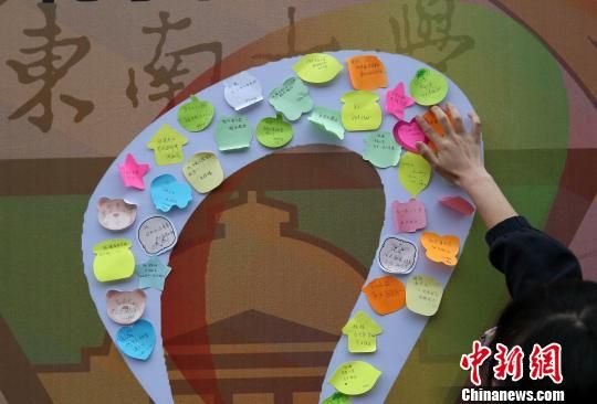 图为市民在110周年的校庆标识上贴上写有祝福话语的贴纸。 泱波 摄