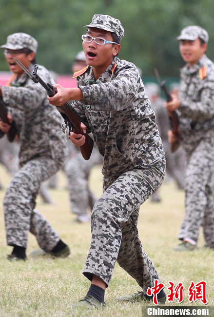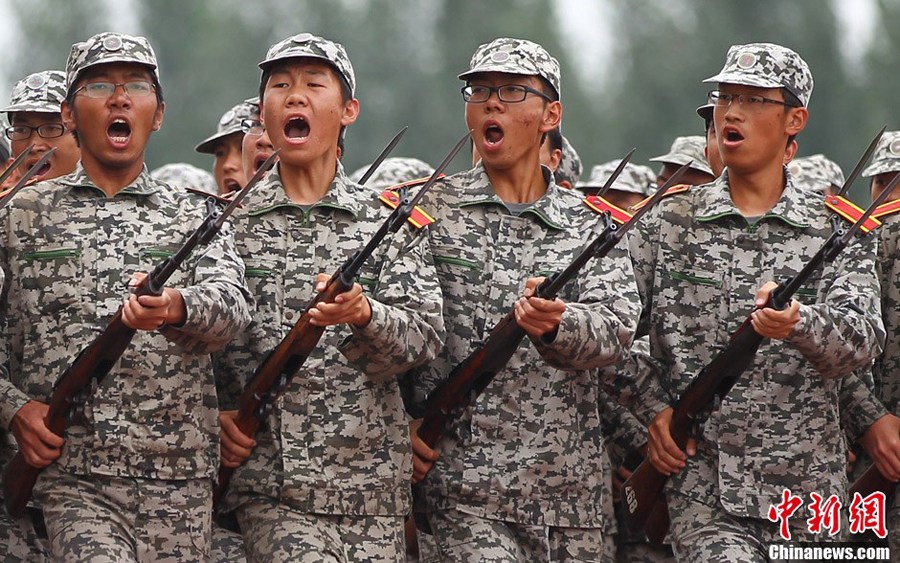 【中新网】南京军训大学生举出“捍卫祖国神圣领土”横幅
