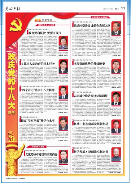 “我们一定会把党的十八大精神学习好,贯彻落实好,继续坚持育人为本、德育为先,进一步深化素质教育,为社会输送更多具有创新精神的高素质人才。”郭广银信心满怀地说。(本报记者 郑晋鸣)