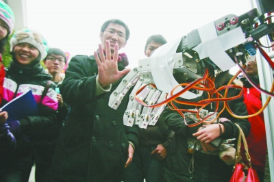 日前,东南大学自动化学院学生在展示能“感知”人手动作的机械手。东南大学举行2012年大学生科技创新创业成果展示会,340多件学生科技创新作品及项目成果参加展示。