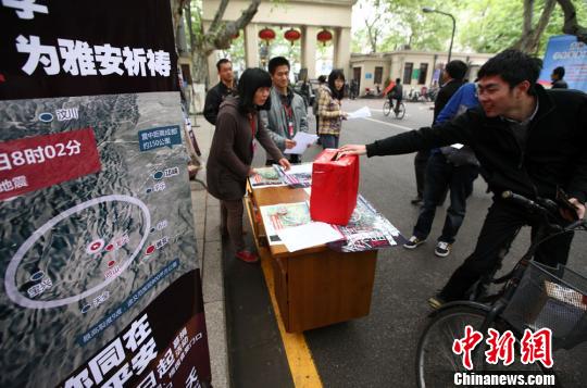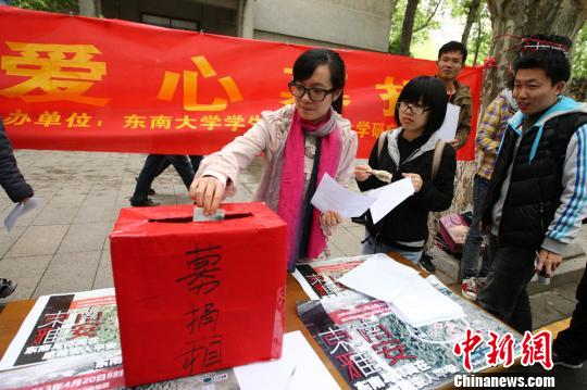 4月23日,南京东南大学的学生往捐款箱内捐款,为四川地震灾区献爱心。泱波 摄