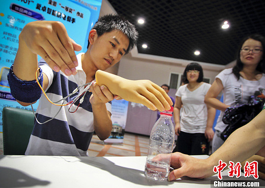 6月4日,设计者演示智能肌电假手,利用模糊比例控制技术配备完善的力触觉反馈系统,实现假手的控制自如。中新社发 泱波 摄