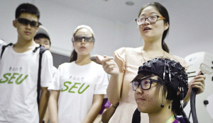 昨天上午,在东南大学显示技术研究中心3D实验室,一个表面满是钉子、电极的帽子引起了营员们的好奇。