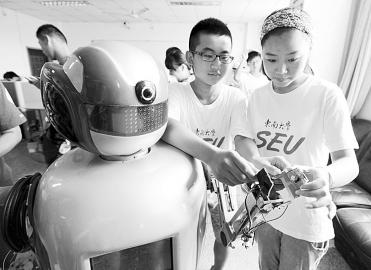 为期一周的“2013青少年高校科学营”东南大学分营于7月10日开营,来自全国各地的250名高中生营员在这里参加30多项活动,体验科学,激发科学梦想。图为两名营员在参观具有服务作业功能的智能机器人。 新华社记者 孙 参摄