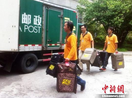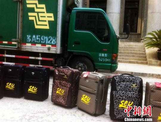 东南大学今年特为贫困新生们准备了近300个行李箱,14日,东南大学率先向57名贫困新生寄发了行李箱。 盛捷 摄