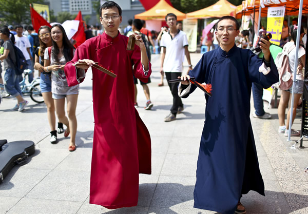 9月16日是2013级同学在东大正式开始求学生活的第一天,青春在这百年校园里汇成了一股热流。同学们一方面亲身体验到“学在东大”的浓郁学风的时候,另一方面也感受到东南大学的悠久校园文化传统何绚烂缤纷的大学生活。在联合招新的现场,彩旗飘扬,人声鼎沸,包括科学技术、体育健身、文化艺术、文学传媒、志愿服务等在内的五大类、120个学生社团占据了整个广场,倾情上演“百团大战”,他们各显神通,充分展示东大学子的青春激情和才思创意,吸引着近4000名新生加入一个个文化的舞台。主席台上,各个社团现场表演精彩纷呈,各个社团在台下也摆开阵势,竞绽风采,从国学、书画、汉服等传统文化形式到航模、花艺等现代人文景观;从微软技术、新闻社到创业、职业发展,从体育、艺术、cosplay花车到支教、爱心、红十字会……文化汇聚,青春激荡,成为东大校园的壮丽景观。活动共吸引了近5000多名学子参加。开幕式结束后,林萍华副校长和刘波副书记兼副校长一行到各个社团展台前参观,和社团成员进行互动交流,看到丰富多彩的社团和精彩纷呈的活动,他们对我校蓬勃发展的学生社团和校园文化给予了高度肯定。