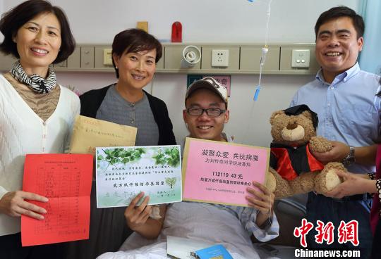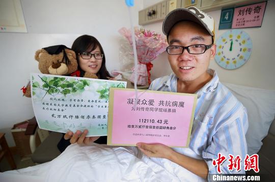 9月30日,不幸罹患骨癌的南京东南大学信息科学与工程学院2012级通信专业硕士研究生刘传奇收到师生们送来的近二十万元捐款开心不已。刘传奇来自湖北仙桃的一个偏远农村家庭,家庭经济情况困难,难以承受20多万元的治疗费用。在得知他患病这一消息后,东南大学教育基金会开通学生重大疾病募捐网上平台接受捐款,同时师生们用现场募捐等方式,共募集爱心资金191478.64元,为他解决燃眉之急,送来爱心正能量。