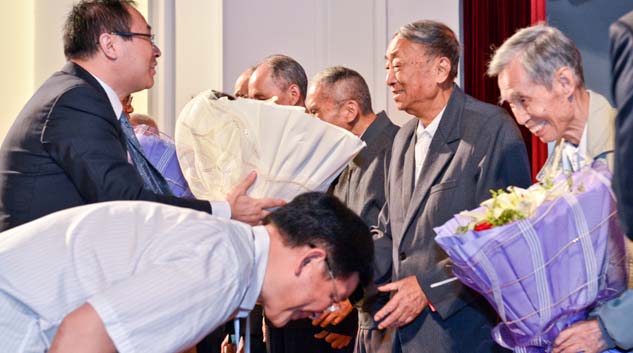 掌声如雷的大礼堂里,几千名校友济济一堂,当祥和的背景音乐响起时,颇具温情的一幕出现了:几名须发斑白的老人在掌声中,激动地接过了嘉宾恭送上的盛放的康乃馨。如此一幕,就发生在当天的庆典现场。