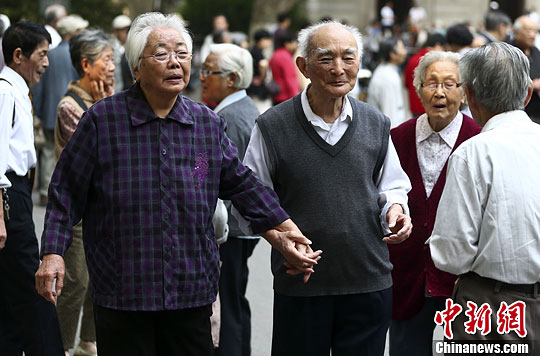 10月11日,老寿星们在拍摄照片。中新社发 泱波 摄