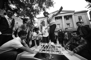 昨天,南京东南大学土木工程学科成立90周年,学生们在校园内晒自己设计的作品。各种桥梁的模型以及设计感十足的体育馆的模型,让人感到很是高端。其中最有趣的是学生们现场用细木头搭设的模型桥梁,竟然可以承受近70公斤的人站在上面,让不少围观的学生大开眼界。