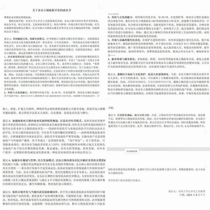 余东古镇实地调研结束后,实践团成员召开了线上会议进行讨论,以头脑风暴的形式积极为古镇的开发发展建言献策。最后,在借鉴乌镇、宏村等传统历史文化名镇的发展模式,参考河南戏剧幻城的打造模式的基础上,实践团针对余东古镇的历史、现状及未来发展形成了一份完整的建议书并呈递给了余东镇启凤街党群服务中心,希望能为余东古镇的发展贡献一份力量。建议书覆盖发展模式创新、民生福祉改善、综合环境治理、商业发展规划、古镇特色打造、网络宣发策略等多个方面,以一条“彰显古镇特色、满足游客精神文化需求的特色发展道路”为重点,阐述了包括历史场景的还原与活化、科技文化融合在内的创新性开发措施,体现了青年大学生在建设家乡、投身社会、文化传承等方面的责任与担当,展现了历史文化名镇开发的可行举措与美好前景。