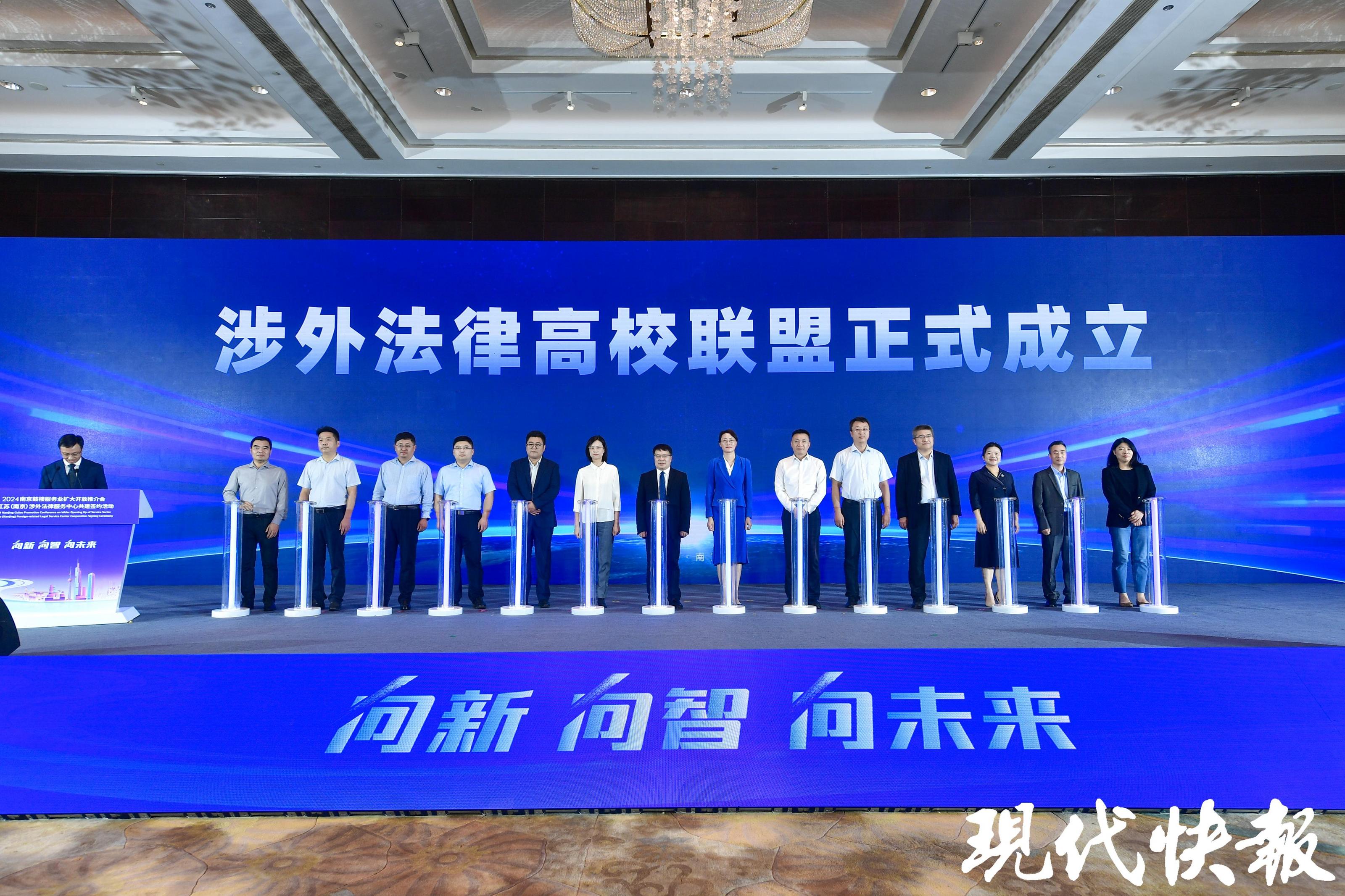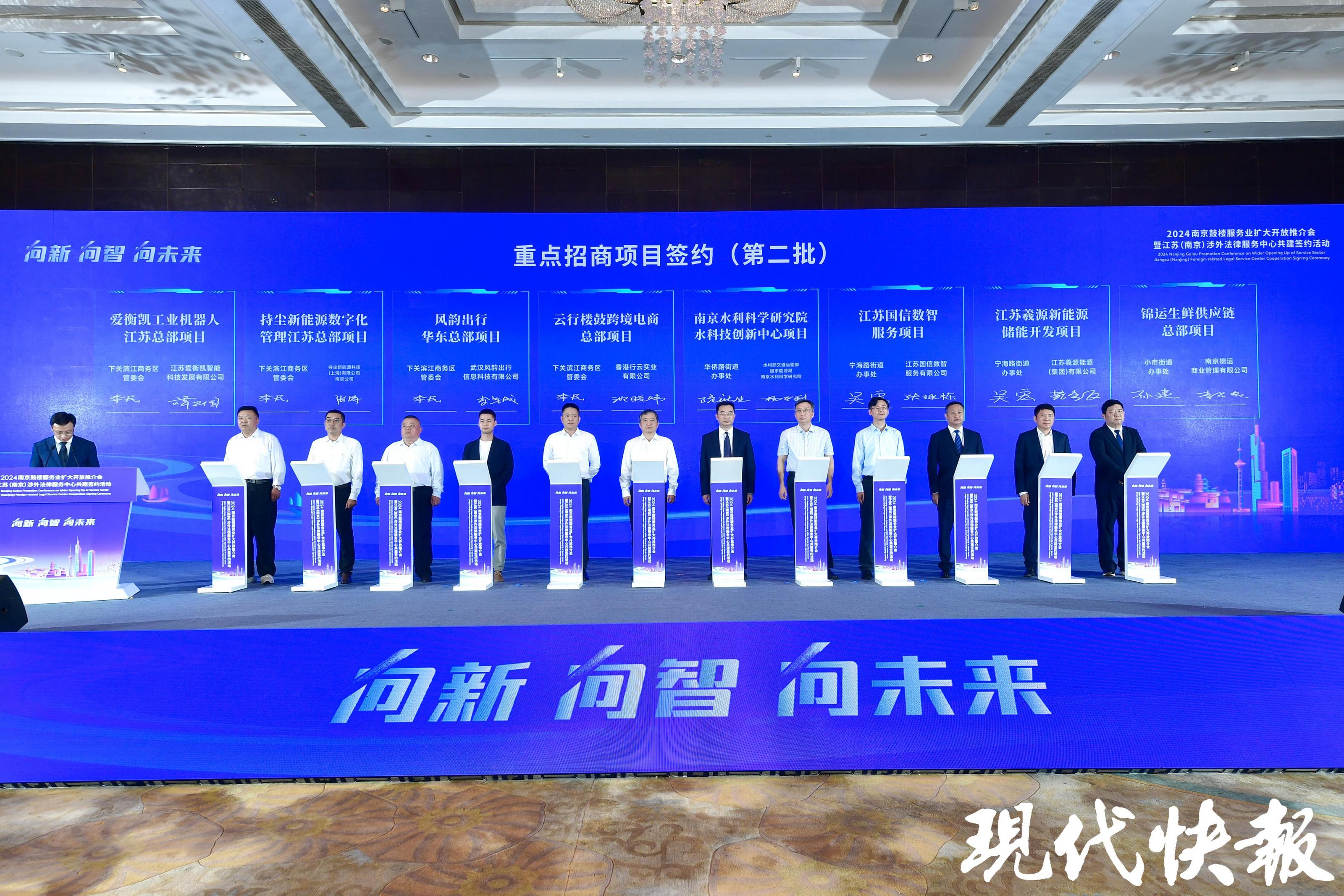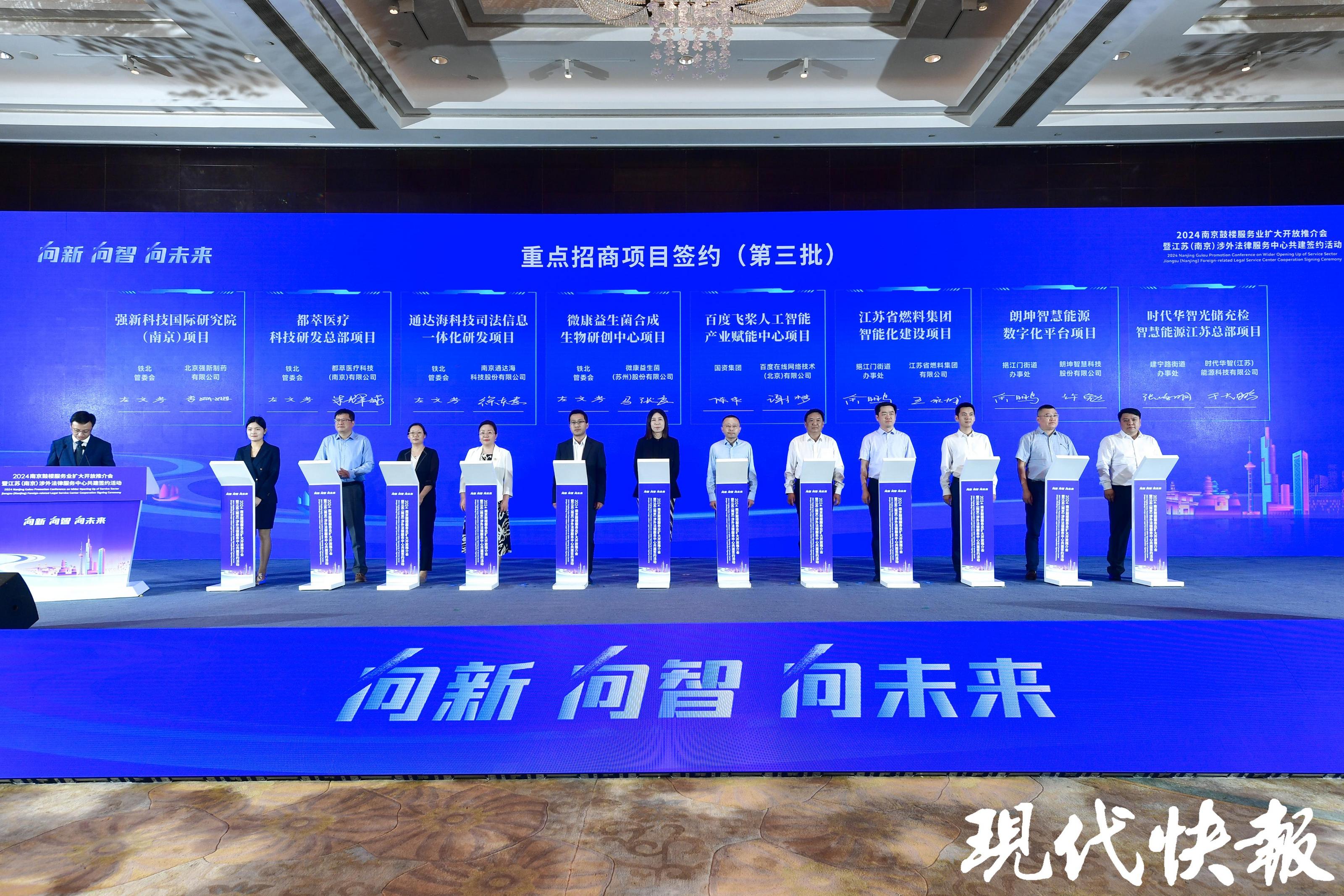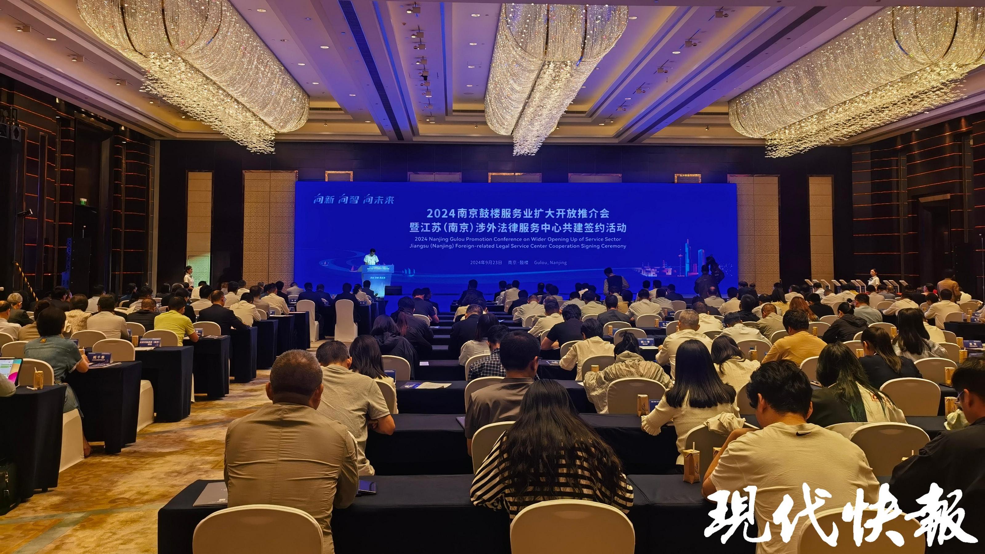 现代快报讯(通讯员 鼓轩 记者 杜雪迎 文/摄)向新,向智,向未来。9月23日下午,2024南京鼓楼服务业扩大开放推介会暨江苏(南京)涉外法律服务中心共建签约活动举行。江苏(南京)涉外法律服务中心正式落地鼓楼,首批12家入驻单位和24个重大合作项目完成签约,未来将整合律师、公证、司法鉴定、行政复议等职能及涉外诉讼、国际商事仲裁、涉外检察等职能,实现法律服务一站式供给。
