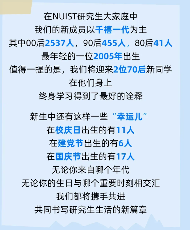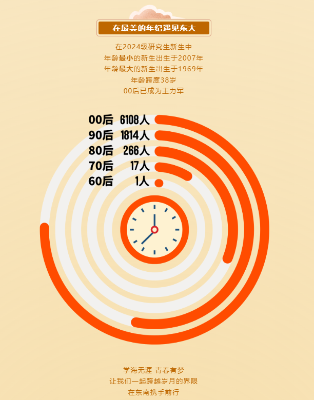 在2024级研究生新生中,年龄最小的新生出生于2007年,年龄最大的新生出生于1969年,年龄跨度38岁,00后已成为主力军。刘畅、陈晨、李想、王硕、张涵……这些名字太受欢迎了,他们都能在校园碰到同名同姓的小伙伴。