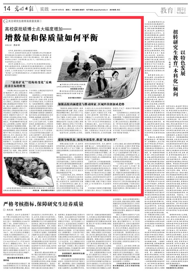 2024年全国教育大会上,习近平总书记发表重要讲话指出,要优化高等教育布局,完善高校学科设置调整机制和人才培养模式。这轮硕博士点的新增,对未来研究生教育的总体规模、学科专业结构、人才培养成效会产生何种影响?如何在“增数量”的同时“保质量”,让不断涌现的高端专业人才助推改革持续深化,赋能中国式现代化建设?