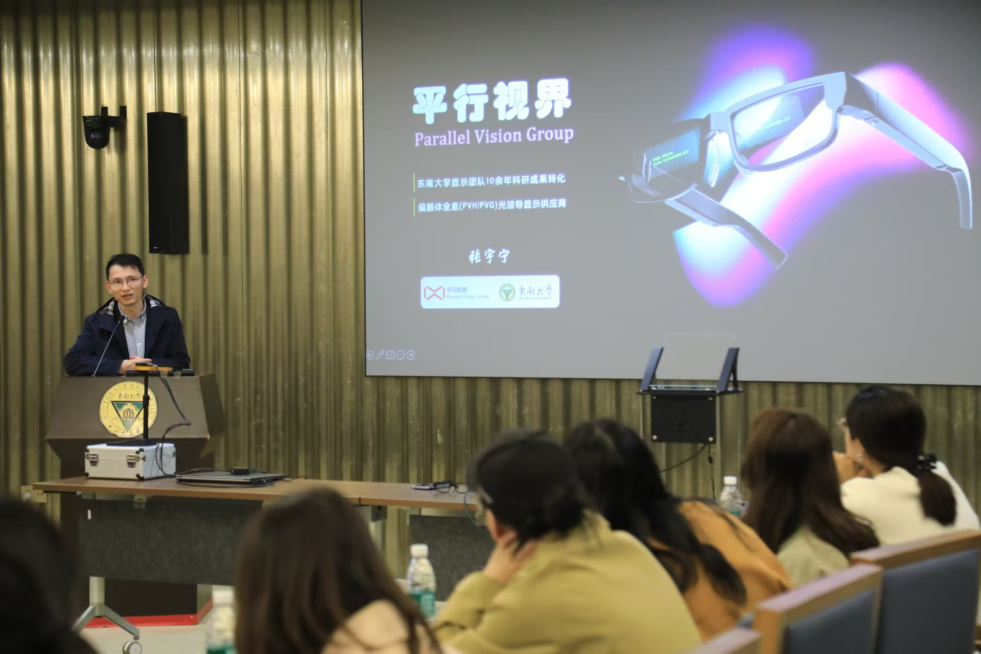 发布会现场,记者戴上“云雀”AR眼镜概念验证机,眼前的现实场景中即出现了一个虚拟屏幕。记者与研发团队交流中,眼镜里的虚拟屏幕实时显示着现场对话的中英文两个版本文字。“这款眼镜看上去和普通眼镜外形差不多,但实际上它的镜片上有一层2微米厚的光学膜,而这款膜正是让眼镜实现显示功能的关键。”研发团队负责人、东南大学电子科学与工程学院张宇宁教授告诉记者,智能眼镜目前主要有VR和AR两大技术方向,VR眼镜戴上后看到的都是虚拟画面,看不到现实世界;而AR眼镜则让用户既可以看到现实世界,同时也可以看到虚拟世界。