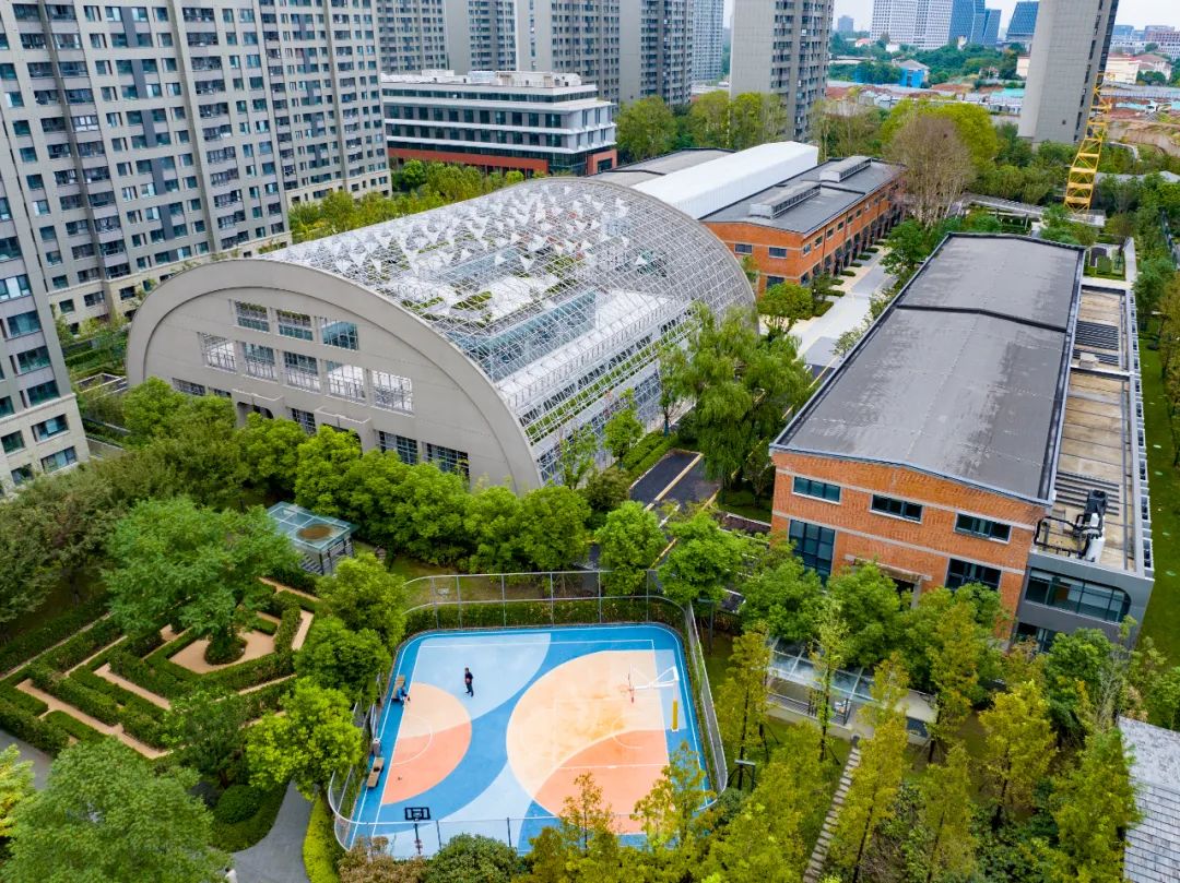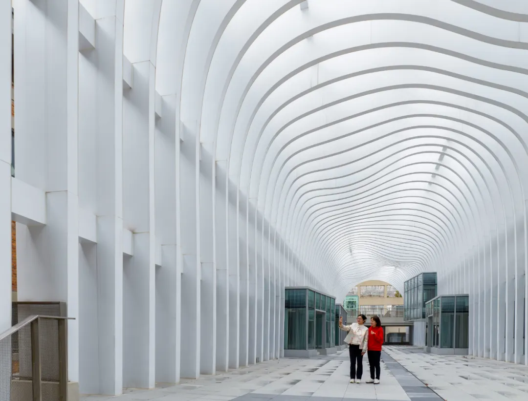 长廊尽头,则是又一个巨大的拱架空间。这里层次分明,种植着不少绿植。据介绍,团队利用零件库的拱顶,形成下层智慧菜场,上层育儿园、屋顶花园和社区农场的立体奇幻组合,强化“生活感”和“烟火味”。偏安西南角的仓库,则将用于街道社区办公及办事大厅。项目还在临街处,建设了一座风貌相似的新楼房,未来可引入养老服务。
