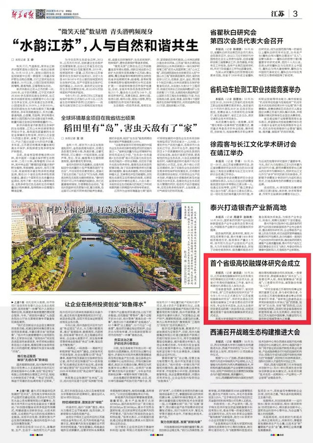 本报讯 (记者 谢诗涵) 10月26日,江苏省高校融媒体研究会在东南大学四牌楼校区召开第九次会员大会。全省67所高校的融媒体工作者、省外兄弟高校代表等近百人参加大会。