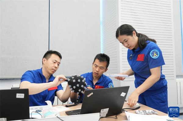 神舟十九号航天员乘组进行舱外航天服维护操作训练(2024年6月21日摄)。新华社发(徐部摄)