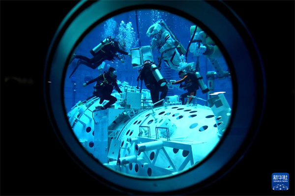 出舱程序训练中,航天员需要穿上100多公斤重的舱外航天服,模拟出舱过闸段动作。由于服装内加了0.4个大气压,王浩泽举手投足比较费力,加上在头盔内头部活动受限,视野也变得狭窄,只能借助腕部反光镜来扩大视野。