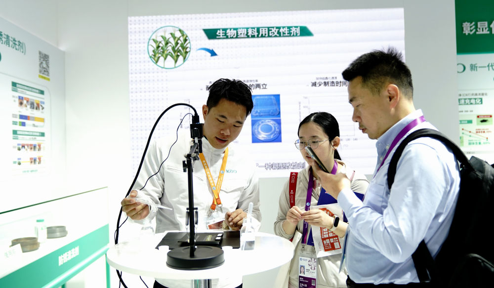 2023年11月9日,在第六届中国国际进口博览会消费品展区某企业展台,工作人员向观众演示环保产品“生物塑料用改性剂”的效果(张建松/摄)