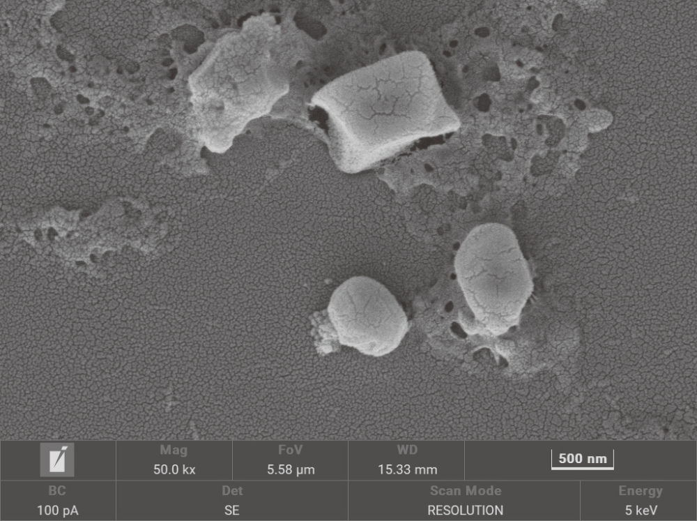 2023年,汪磊团队用电子显微镜拍摄的涤纶衣物洗涤后水中的聚酯塑料纳米颗粒(汪磊/供图)