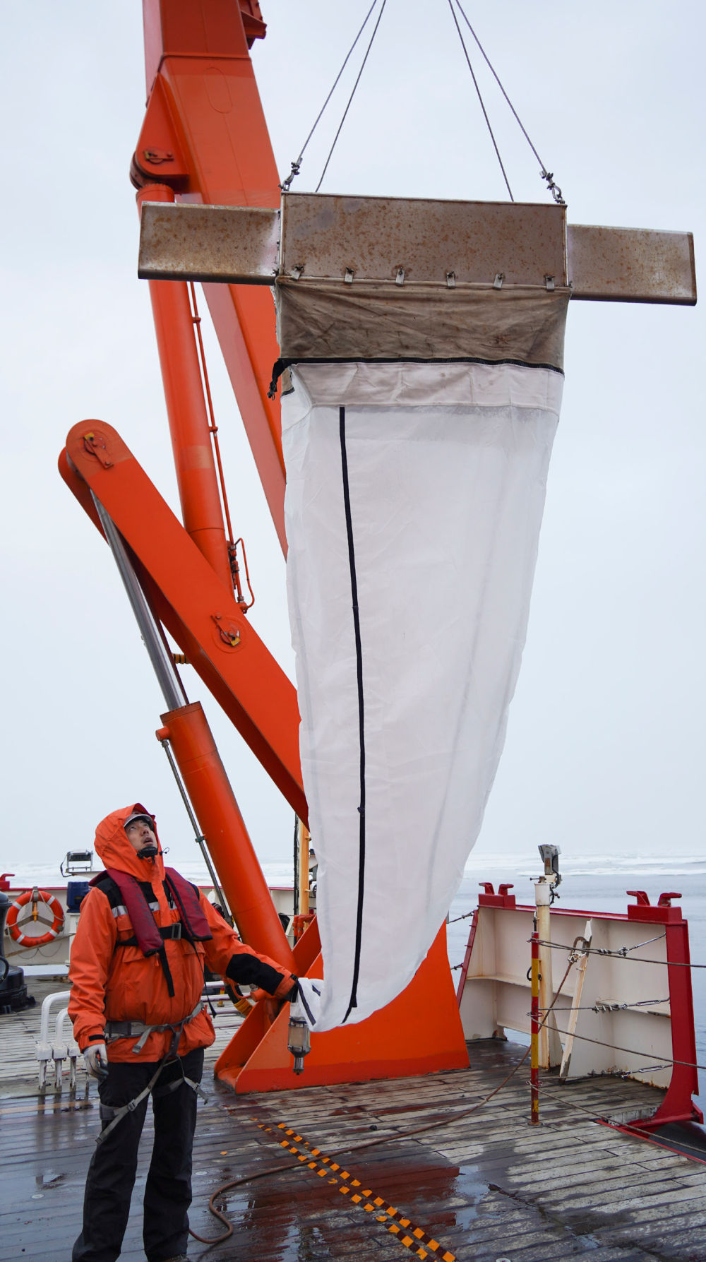 2023年7月26日,中国第13次北冰洋科学考察队队员进行微塑料拖网采样作业(魏弘毅/摄)