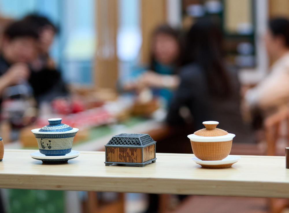 2024年10月17日,比利时布鲁塞尔,以竹代塑:中欧非竹科技创新与绿色产业合作论坛现场。图为用竹子做成的茶具(孟鼎博/摄)