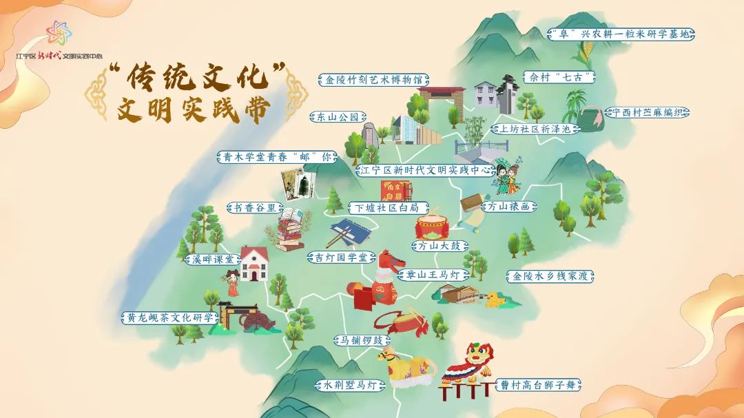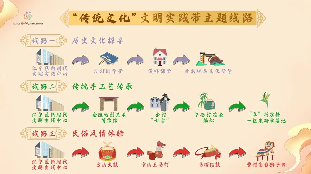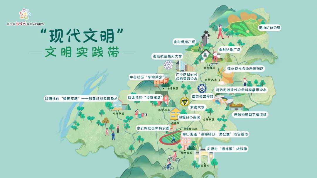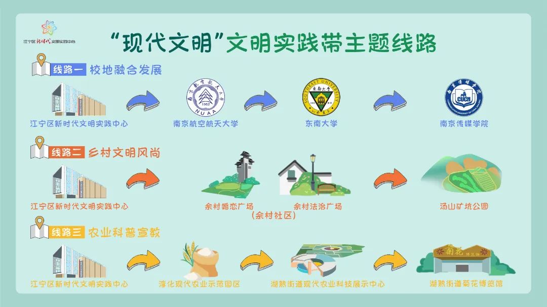 “现代文明”与“传统文化”文明实践带地图由江宁区35个文明实践点位,推出并规划6条主题线路,包括“历史文化探寻”“民俗风情体验”“传统手工艺传承”等3条“传统文化”主题文明实践线路,以及“校地融合发展”“乡村文明风尚”“农业科普宣教”等3条“现代文明”主题文明实践线路。活动当天,参加首场活动的50名江宁“观察员”从江宁区融媒体中心出发。