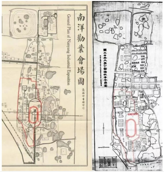 东南大学丁家桥校区范围(右)和南洋劝业会会场范围对照图