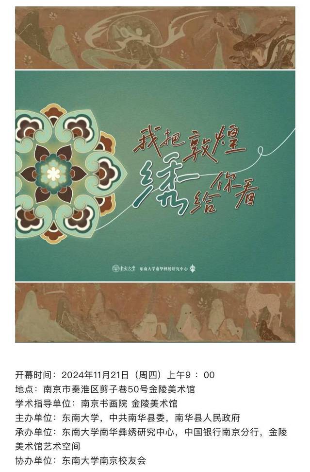 11月21日上午,由东南大学、中共南华县委、南华县人民政府主办的“我把敦煌绣给你看——云南楚雄南华彝绣展览”在南京金陵美术馆艺术空间开幕,金陵美术馆馆长刘春杰、南华县委常委、县委组织部长李忠琴、东南大学艺术学院书记赵天为先后致辞发言,东南大学定点帮扶南华彝绣文化驿站10号站启动和中国银行南京分行“中银薪喜服务站”揭牌仪式随之进行。