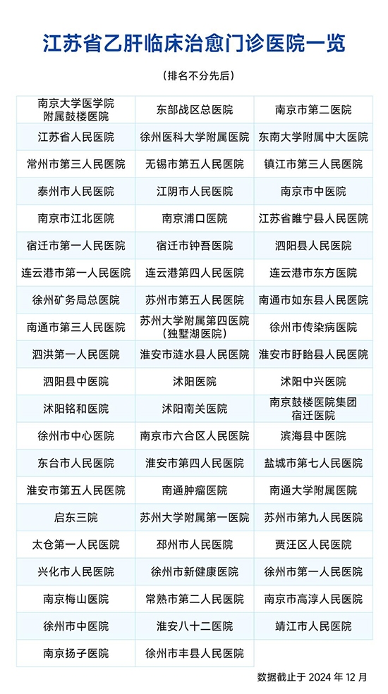截止2024年12月,江苏省已有62家医院开设了“乙肝临床治愈门诊”,极大地方便了患者就近就医。