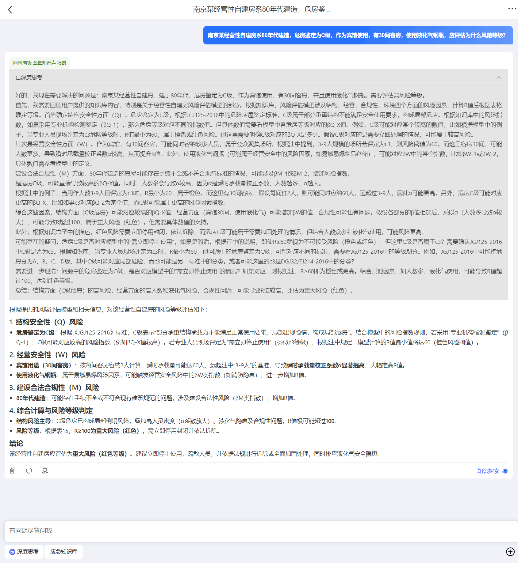 “南京某经营性自建房系上世纪80年代建造,危房鉴定为C级,作为宾馆使用,有30间客房,使用液化气钢瓶,应评估为什么风险等级?”