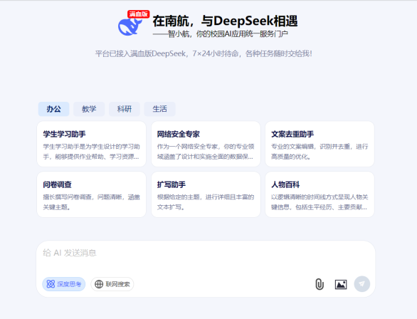 智能客服、内容创作、论文翻译、代码解析……今年春季学期,南京航空航天大学的师生们有了专属“小秘书”——DeepSeek“智小航”,无论是学习还是日常琐事,都能为师生“排忧解难”。