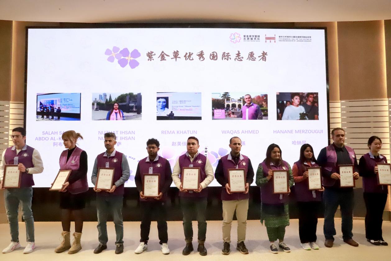活动中,纪念馆分别为2024年度“紫金草优秀志愿者”“紫金草特殊贡献志愿者”“紫金草优秀志愿团队”和“紫金草优秀国际志愿者”颁奖。志愿者代表为新进的10名紫金草志愿者授工作牌。(徐红霞 李安琪)