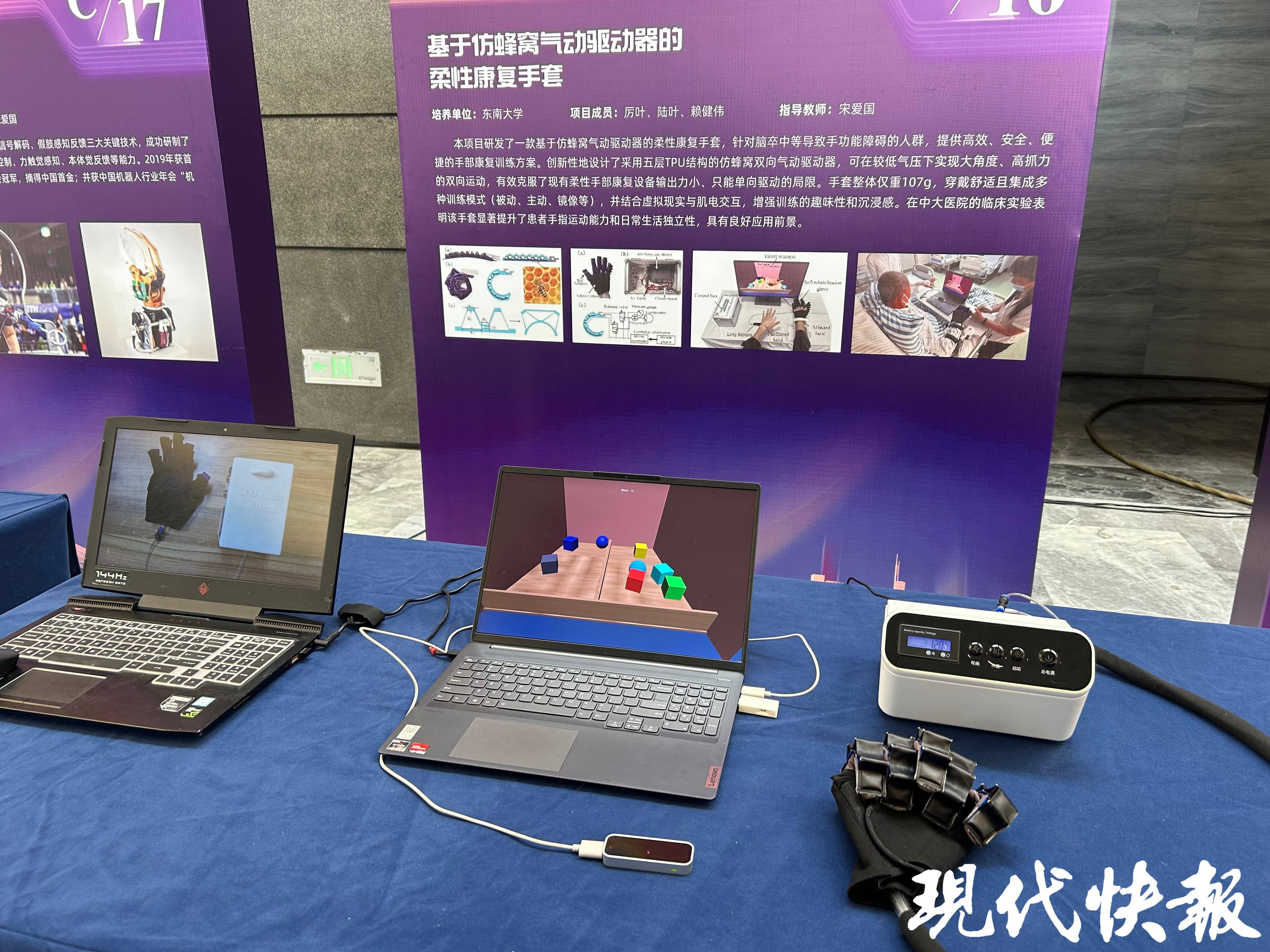 在创新实践成果展区,一款由东南大学团队研发的“柔性康复手套”吸引众人驻足。这个曾在2023年“中国研究生电子设计竞赛”中斩获一等奖的项目,如今已在江苏省人民医院和东南大学附属中大医院开展临床试验,试验结果显示,患者康复治疗效果得到显著提升。