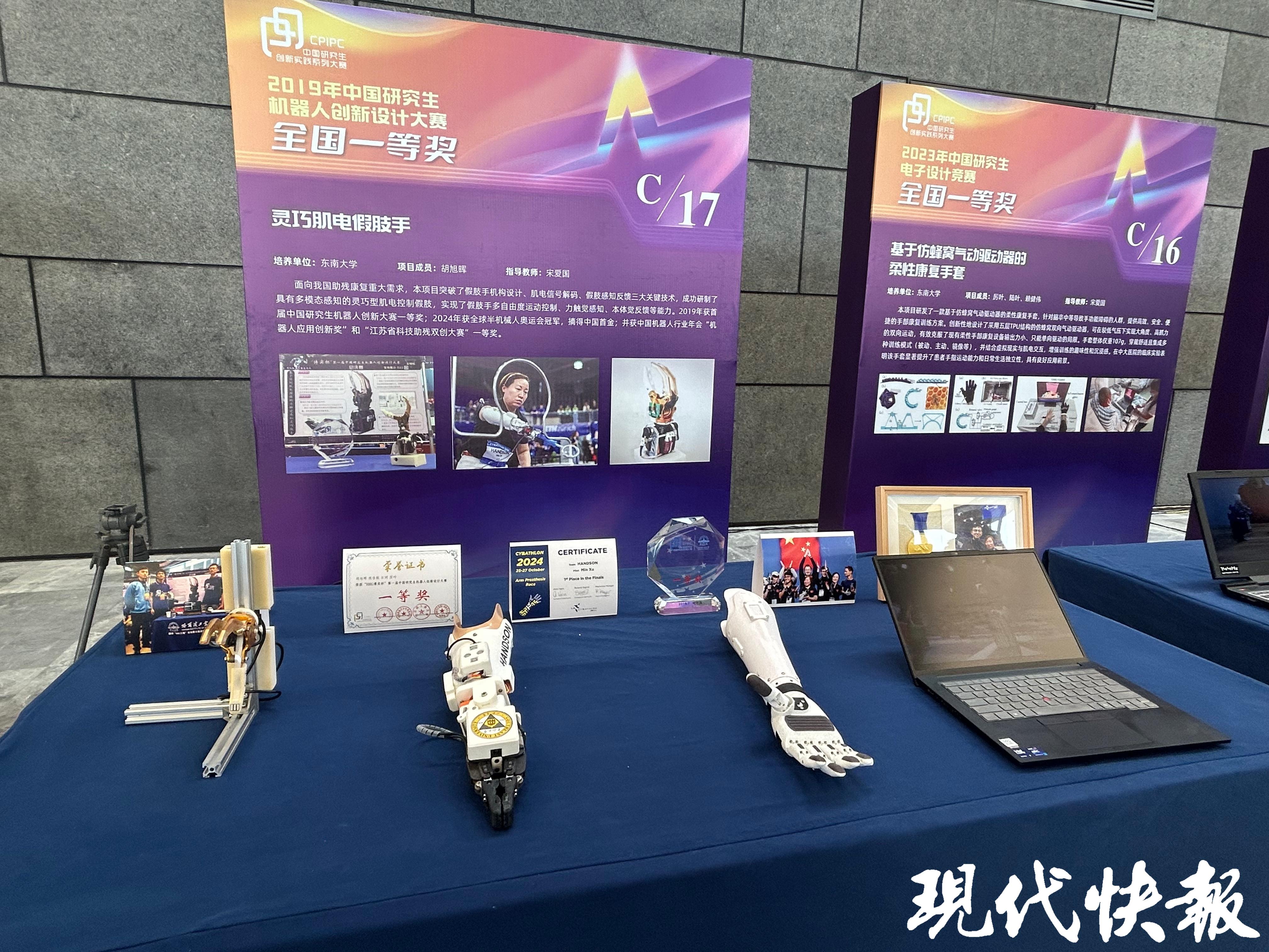 2024年刚斩获第三届全球辅助技术奥运会(又称“半机械人仿生奥运会”)“上肢义肢”组冠军的“智能手”也在现场亮相,并且产品再次升级。“比赛过后我们又马不停蹄地升级了这个产品。有的地方在日常使用中还是存在不可靠的地方,所以我们在结构、电机控制等方面进行改进,让它在日常生活中更可靠,使用起来更方便。”东南大学仪器科学与工程学院讲师胡旭晖说。