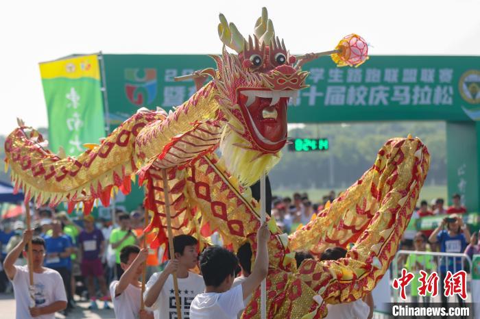 图为大学生舞龙为校庆马拉松助威。中新社记者 泱波 摄
