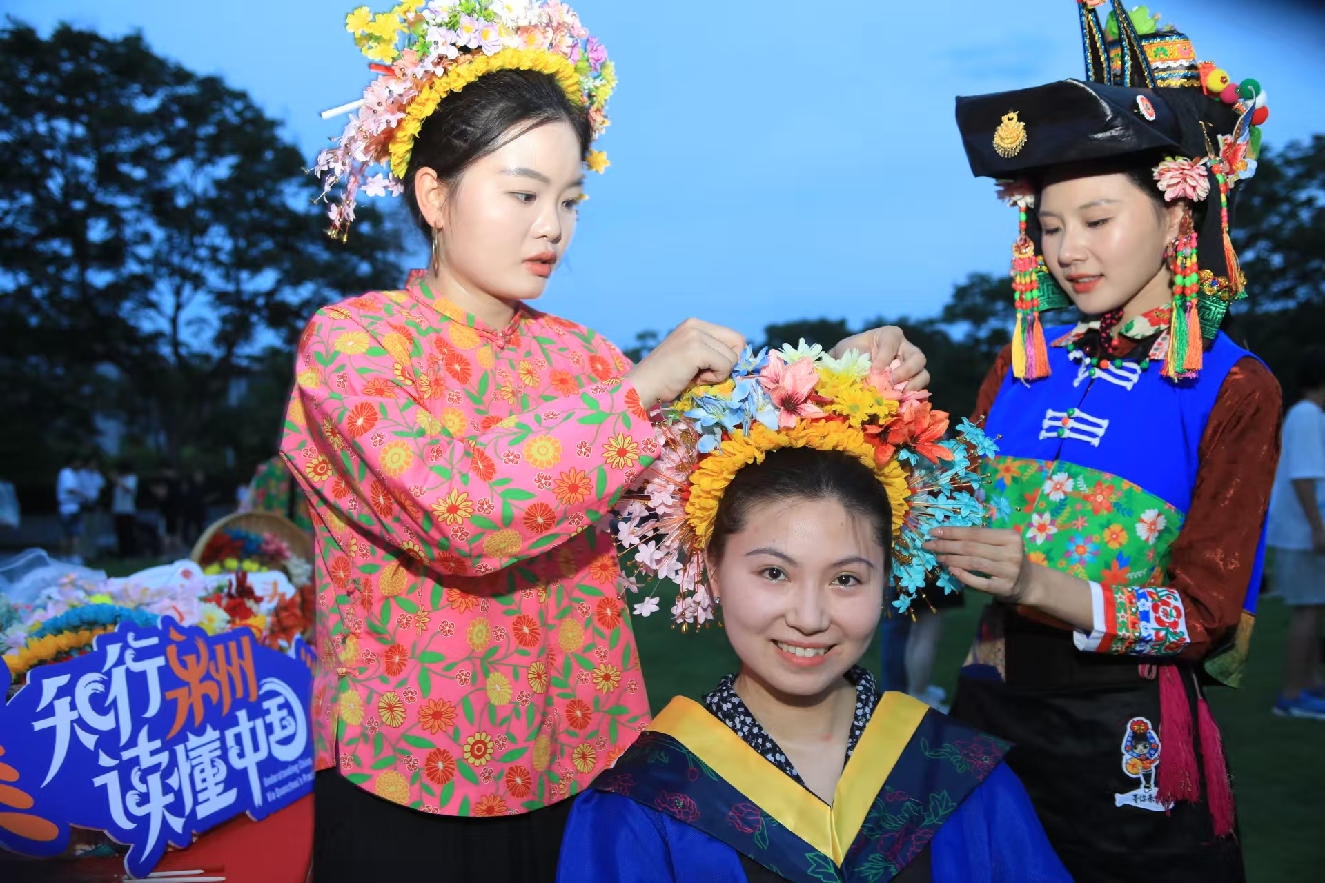 现场,泉州非遗传承人还现场为学子簪上象征“一路生花”的鲜花,将传统文化与现代毕业礼巧妙融合。“我现场体验了簪花,感受到了非遗独特的美,也感受到了母校对我们的关怀和用心,非常感动。”经济管理学院冯彦珲说。