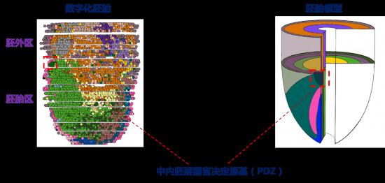 研究发现,小鼠胚胎发育到7.75天时,胚内-胚外交界处出现一个独特的信号“洼地”——器官原基决定区(PDZ)。此时该区域紧邻的胚内、胚外部分分别呈高浓度的信号抑制分子和激活性配体分子,但区域内呈现低信号活性“洼地”,表达多种受体信号基因,由此形成易于接收多胚层信号调控输入、驱动心脏与前肠等器官原基协同发育的微环境。微环境信号被转化为基因选择性表达指令后,驱动心脏等器官原基形成。