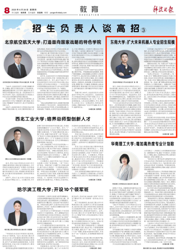 “作为在全国首批开设未来技术学院的高校之一,我们希望培养具有前瞻性、能够引领未来发展的科技创新领军人才,推动前沿交叉科学与未来技术领域产出具有重大影响力的原创性成果。”东南大学招生工作办公室主任张涌介绍,该院已设立未来机器人本科专业,以机械工程、控制科学与工程、仪器科学与技术等学科为依托,融合了信息、电子、计算机、材料、医学影像等方向的新兴交叉学科专业,着力培养解决机器人领域未来5—10年后可能出现的原创性、交叉性和颠覆性技术问题的领军人才。