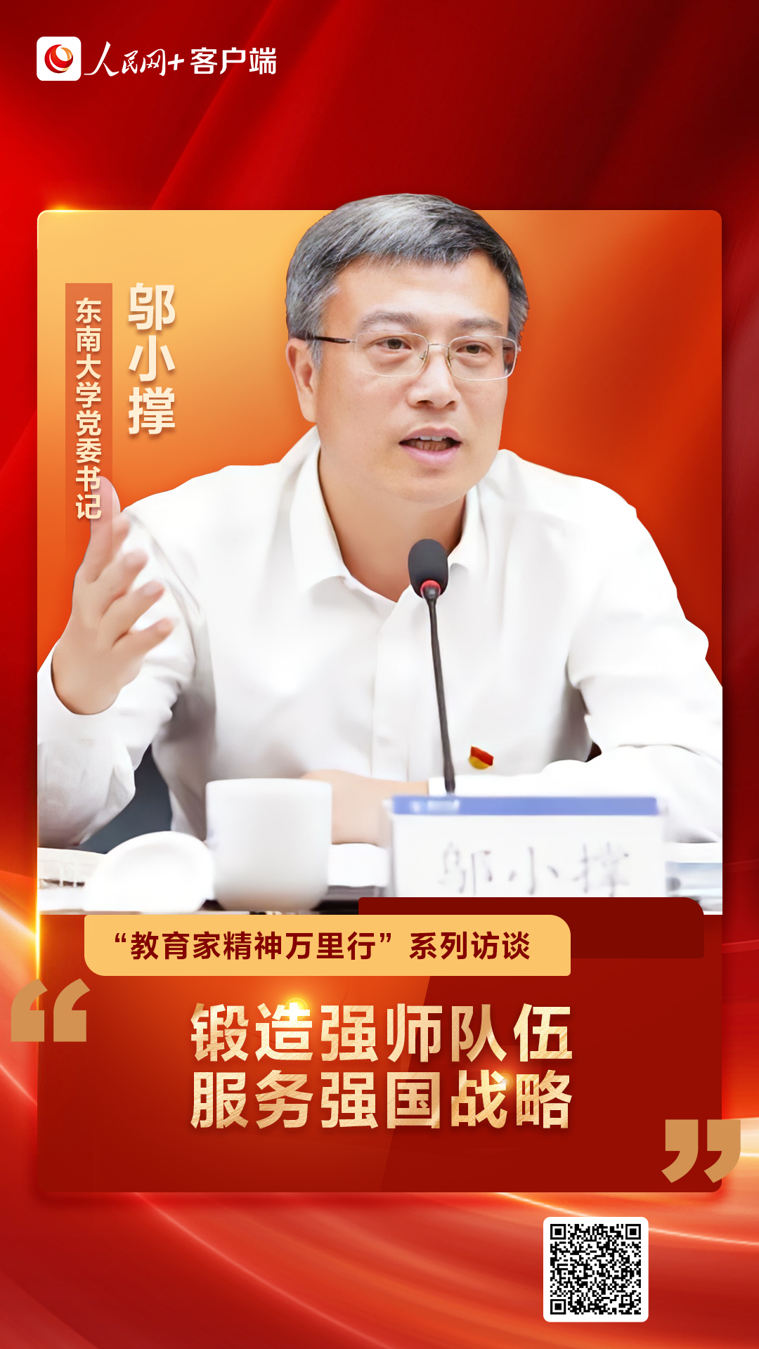 “教育家精神是教育强国建设的灵魂,弘扬教育家精神则是建设教育强国的精神动力和信念支撑。建设中国特色世界一流大学,培育拔尖创新人才,必须构建‘大先生’竞相涌现的强师体系,锻造‘经师’与‘人师’相统一的卓越队伍。”近日,东南大学党委书记邬小撑接受人民网专访时表示。