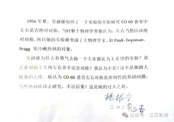 跨越时空的科学共鸣,在2022年东南大学120周年校庆暨吴健雄先生诞辰110周年之际,达到了一个新的高度。彼时已近期颐之年的杨先生,以最郑重的方式——亲笔撰文,来表达他的敬意。在这份珍贵手稿中,他深刻剖析了吴健雄在几乎整个物理学界质疑面前,所展现出的“原则性的基础问题,当然绝对应该去研究,不计后果!”的非凡勇气与科学赤诚。这份由他签名、并通过《物理科学的第一夫人:吴健雄》作者江才健转赠东南大学的手稿,不仅是两位物理学大师精神对话的绝佳见证,更是杨振宁先生给予东南大学最为厚重的礼物,其上所承载的求真精神与“止于至善”的校训内核交相辉映。