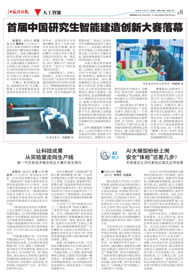 大赛以“数智赋能建造,创新驱动未来”为主题,搭建了全球智能建造领域高层次创新竞技与人才培养平台。这场历经半年角逐的赛事,吸引了全球1300余支团队报名参赛,最终336支队伍晋级总决赛。总决赛中,东南大学学子获奖总数居全国首位:获一等奖12项,二等奖9项,三等奖2项,其中“智桥卫士”团队斩获亚军,“青年人”团队获“最佳风采奖”。