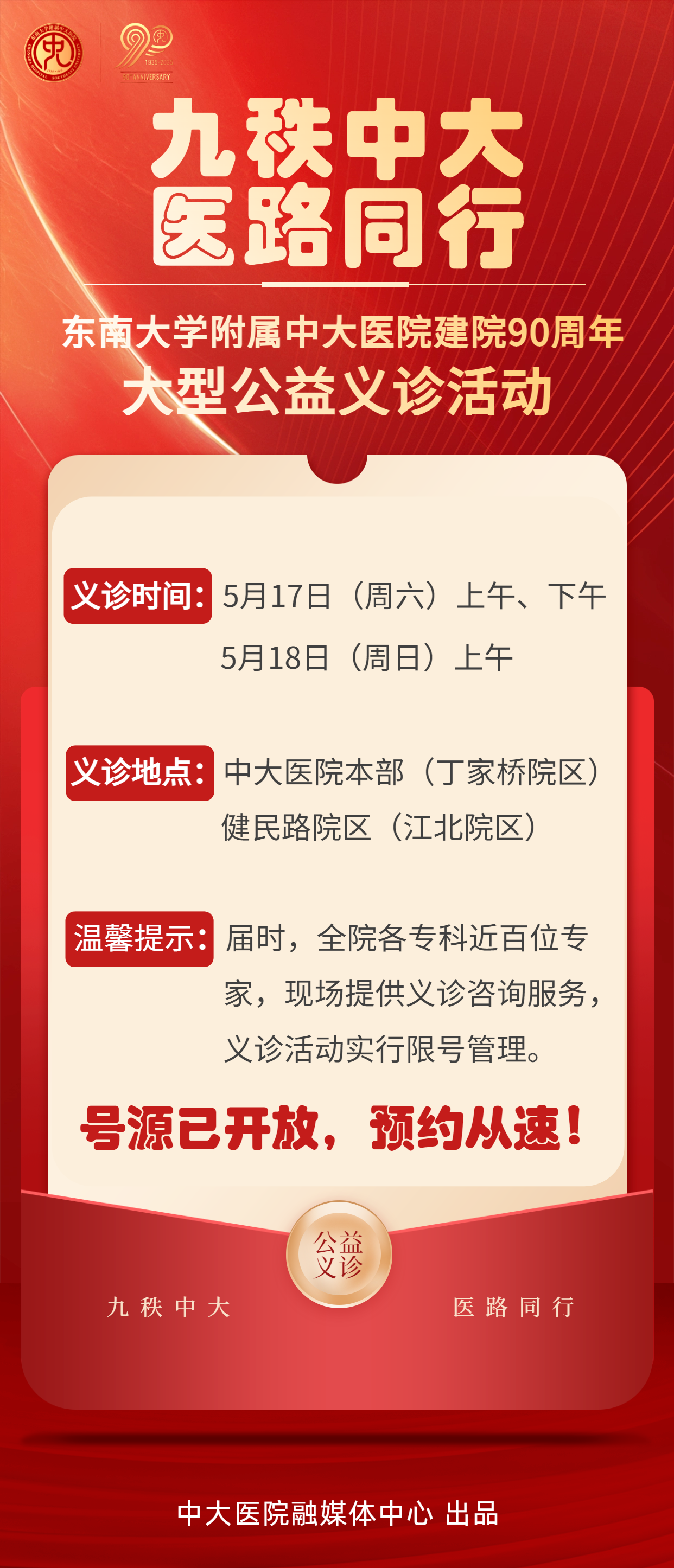 现代快报讯(通讯员 程倩敏 记者 梅书华)九秩中大,医路同行。值此东南大学附属中大医院建院90周年之际,为回馈社会各界关心支持,中大医院一院两区将于5月17日(周六)上午、下午及5月18日(周日)上午,在本部(丁家桥院区)与健民路院区(江北院区)同步开展大型公益义诊活动。义诊期间,全院普通门诊与专家门诊免挂号费,以实际行动服务百姓健康。