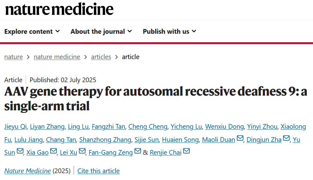 7月2日,东南大学附属中大医院耳鼻咽喉头颈外科柴人杰教授,联合多家单位在国际顶级医学期刊《自然·医学(Nature Medicine)》发表题为“腺相关病毒基因治疗常染色体隐性遗传性耳聋9型:一项单臂试验(AAV gene therapy for autosomal recessive deafness 9: a single-arm trial)”的研究论文,报道了腺相关病毒(AAV)基因疗法在1.5至23.9岁跨年龄段常染色体隐性遗传性耳聋9型(DFNB9)患者群体展现出良好的长期安全性与有效性,并揭示5-8岁为可能为最佳干预窗口期,这一发现具有重要临床指导价值。这一成果不仅是东南大学附属中大医院首次以第一单位和最后通讯单位在该期刊发表研究性论文,更让全球数百万遗传性耳聋患者看到了“听清世界”的希望。