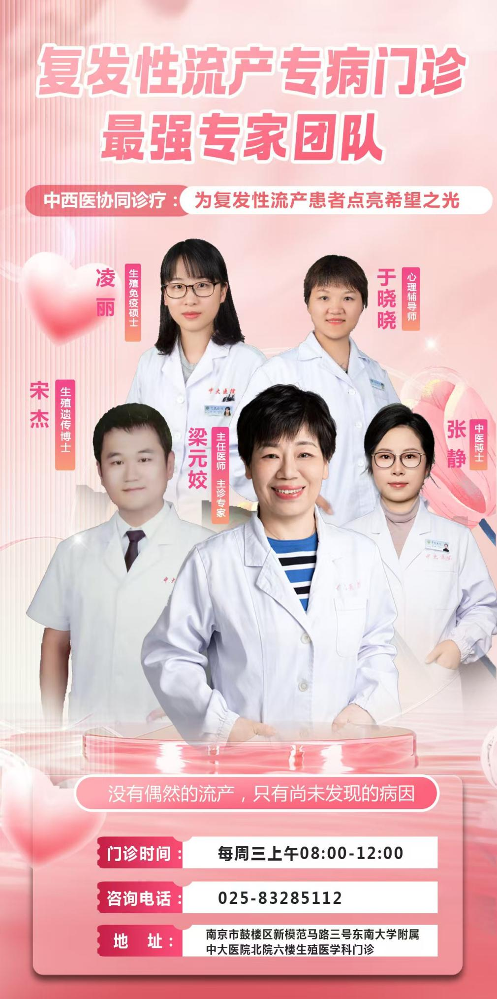 为给复发性流产患者提供更加专业、全面、科学的诊疗服务,即日起,每周三上午,东南大学附属中大医院生殖医学科开设复发性流产专病门诊,中西医协同诊疗,助力您早日拥抱属于自己的健康宝宝。