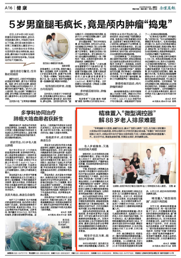 “非常感谢中大医院,感谢刘主任,解决了我的大麻烦!”近日,在东南大学附属中大医院泌尿外科病房里,即将出院的88岁李奶奶激动地说道。“老糖友”李奶奶排尿困难20余天,该院泌尿外科刘宁副主任医师团队为老人实施先进骶神经刺激器置入术。成功手术后,患者就拔除尿管,恢复自主排尿,很快康复出院。